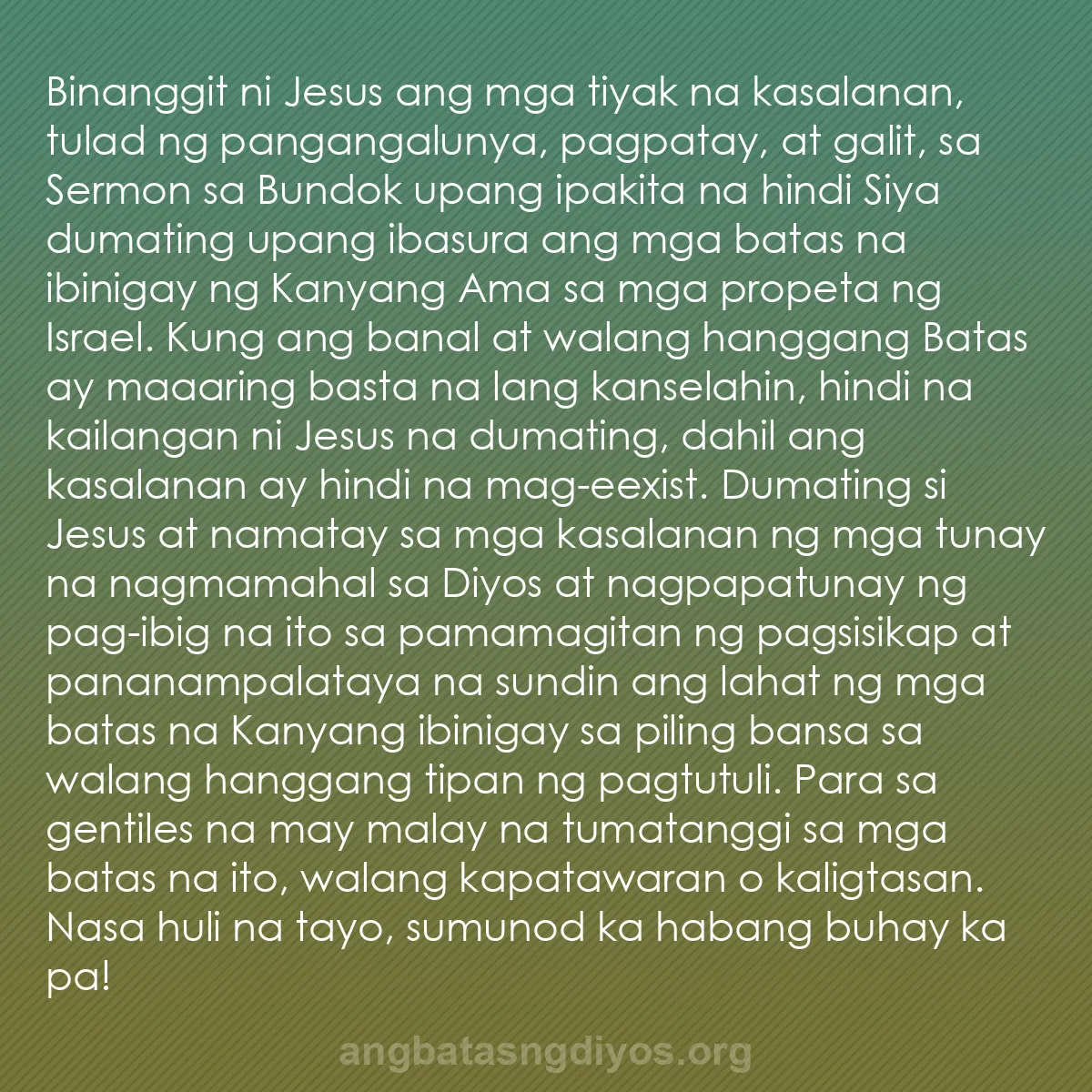 Binanggit ni Jesus ang mga tiyak na kasalanan, tulad ng pangangalunya, pagpatay, at galit, sa Sermon sa Bundok upang ipakita na hindi Siya dumating upang ibasura ang mga batas na ibinigay ng Kanyang Ama sa mga propeta ng Israel. Kung ang banal at walang hanggang Batas ay maaaring basta na lang kanselahin, hindi na kailangan ni Jesus na dumating, dahil ang kasalanan ay hindi na mag-eexist. Dumating si Jesus at namatay sa mga kasalanan ng mga tunay na nagmamahal sa Diyos at nagpapatunay ng pag-ibig na ito sa pamamagitan ng pagsisikap at pananampalataya na sundin ang lahat ng mga batas na Kanyang ibinigay sa piling bansa sa walang hanggang tipan ng pagtutuli. Para sa gentiles na may malay na tumatanggi sa mga batas na ito, walang kapatawaran o kaligtasan. Nasa huli na tayo, sumunod ka habang buhay ka pa! | Ang aking ina at mga kapatid ay silang mga nakikinig sa salita ng Diyos [Lumang Tipan] at ginagawa ito. Lucas 8:21
